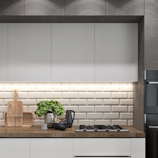 Тренд в дизайне кухни последнего времени - сочетание белых фасадов с матовой поверхностью и темных фасадов с текстурой под бетон. Столешница с ярко выраженной текстурой дерева смягчает строгость линий и сдержанность цветовой гаммы. Стильное решение для ценителей стиля Лофт и Индастриал.