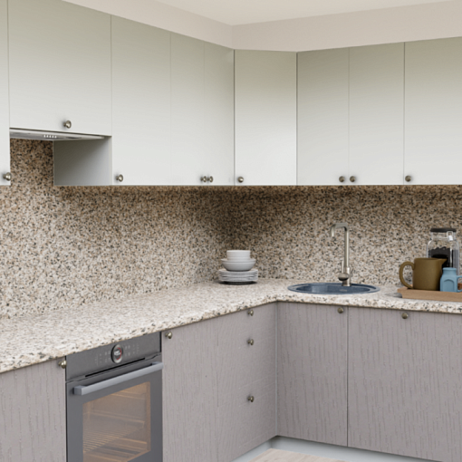 2. Угловая кухня Пастель сливки 1223 со столешницей 3022-S Гранит сардинский и со стеновой панелью 3022-S Гранит сардинский.