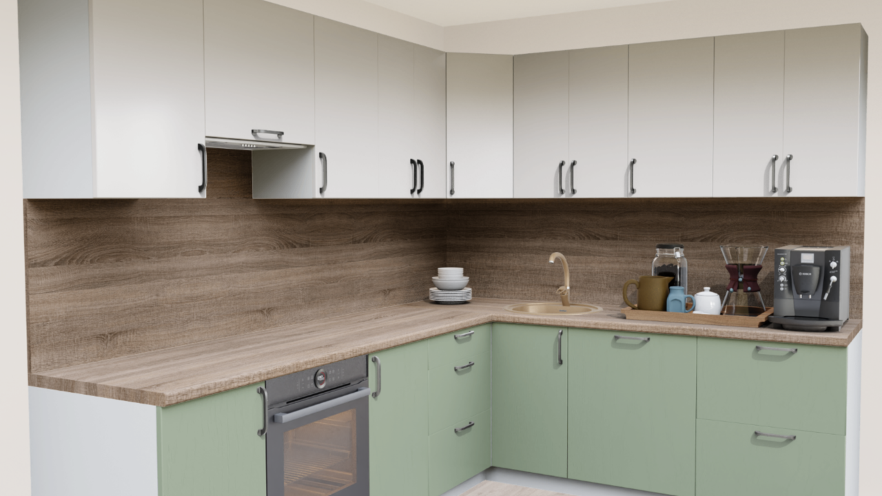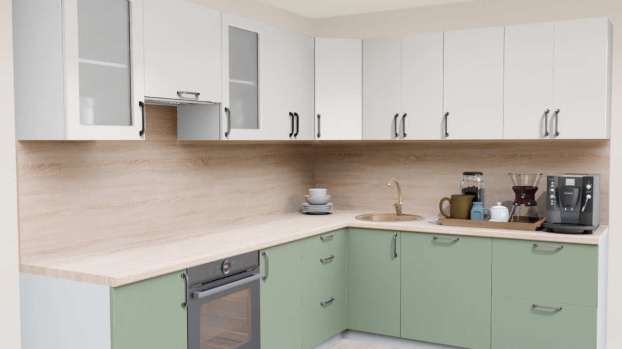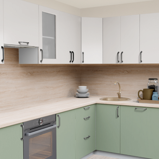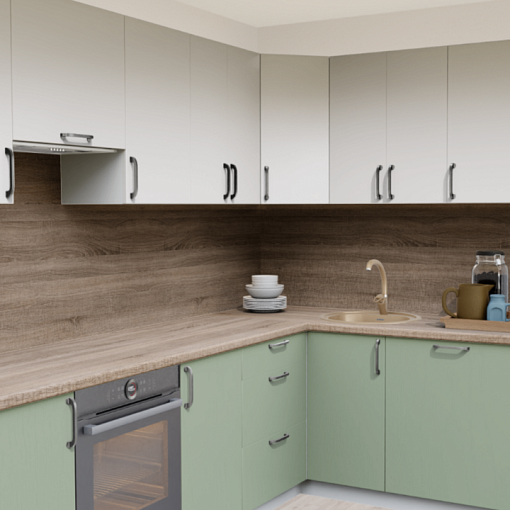 3. Угловая кухня Пастель зефир 1222 со столешницей 232-S Дуб Ниагара и со стеновой панелью 232-S Дуб Ниагара.