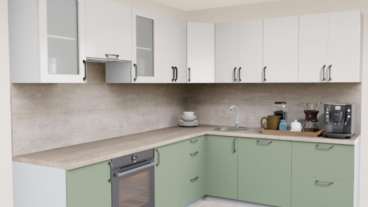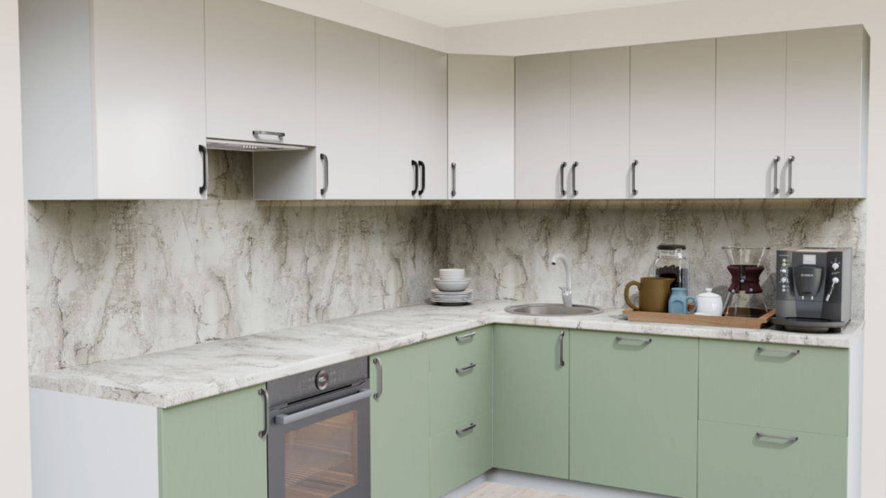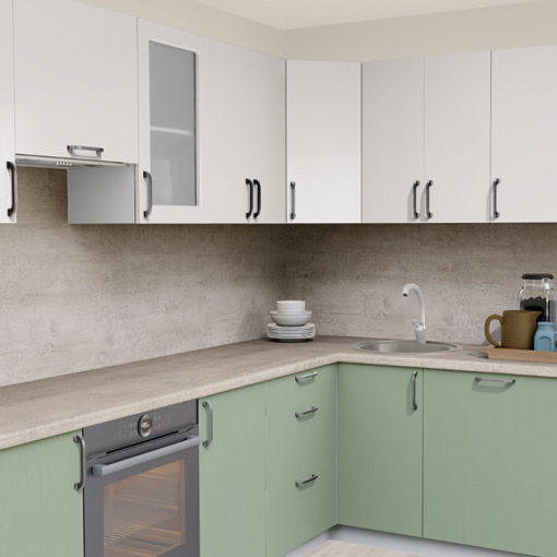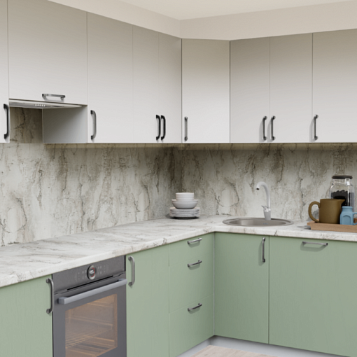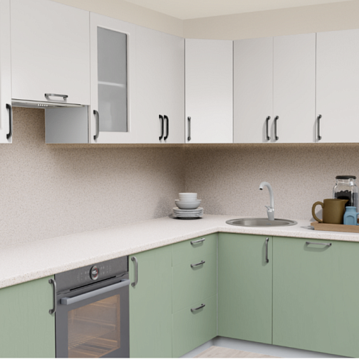 1. Угловая кухня Пастель зефир 1222 со столешницей 2848-S Гренобль и со стеновой панелью 2848-S Гренобль.