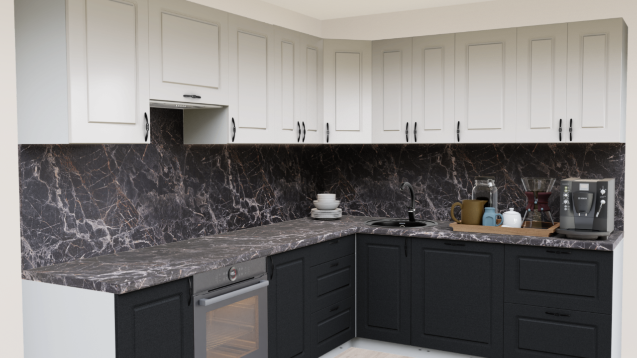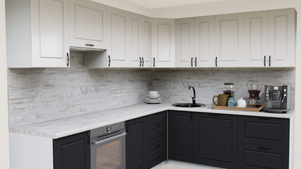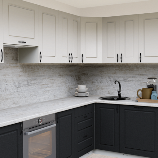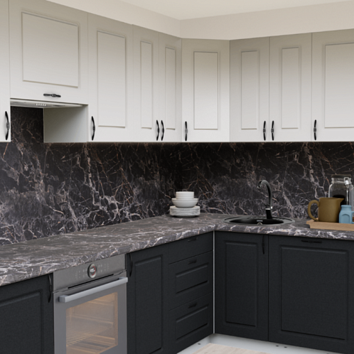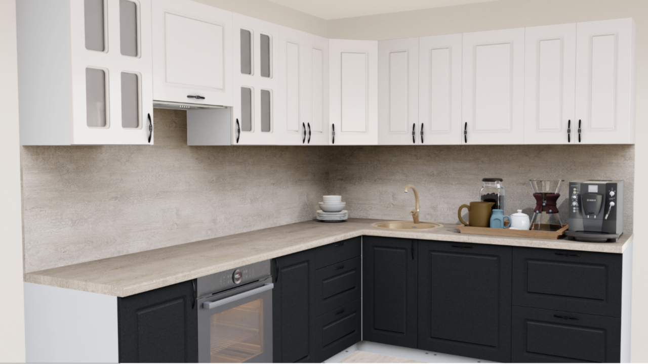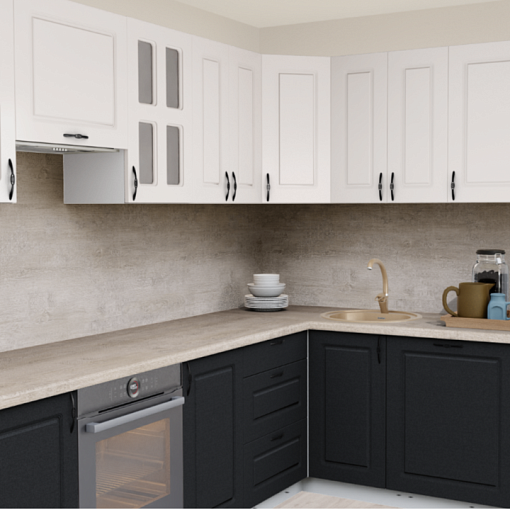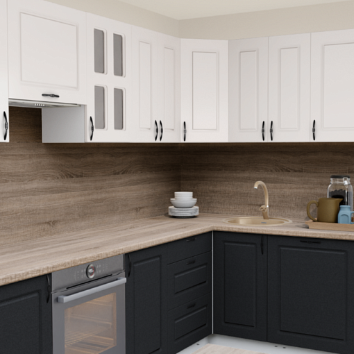 Классический кухонный гарнитур в черно-белом варианте. Матовая поверхность фасадов и прямоугольная фрезеровка сделает это дизайнерское решение более актуальным. Добавьте контрастную фурнитуру и образ кухни будет идеален.