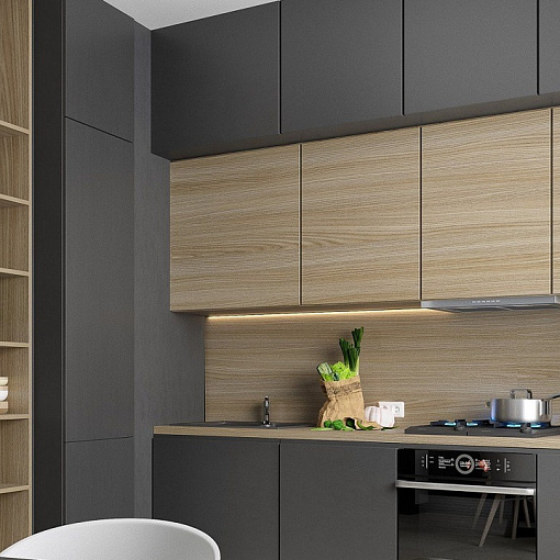 Современный вариант кухонного гарнитура - это сочетание благородного серого оттенка с текстурой светлого дуба на фасадах и столешнице. Светлые оттенки шкафов делают кухню более легкой, а линии нижних и антресольных шкафов раздвигают помещение, делая этот вариант уместным даже в небольшом пространстве.