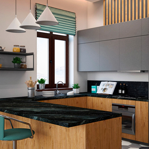 Угловая кухня Пепел 2117 со столешницей 812/СК Летиция зеленая и со стеновой панелью 1207/BR Бриллиант темный графит.