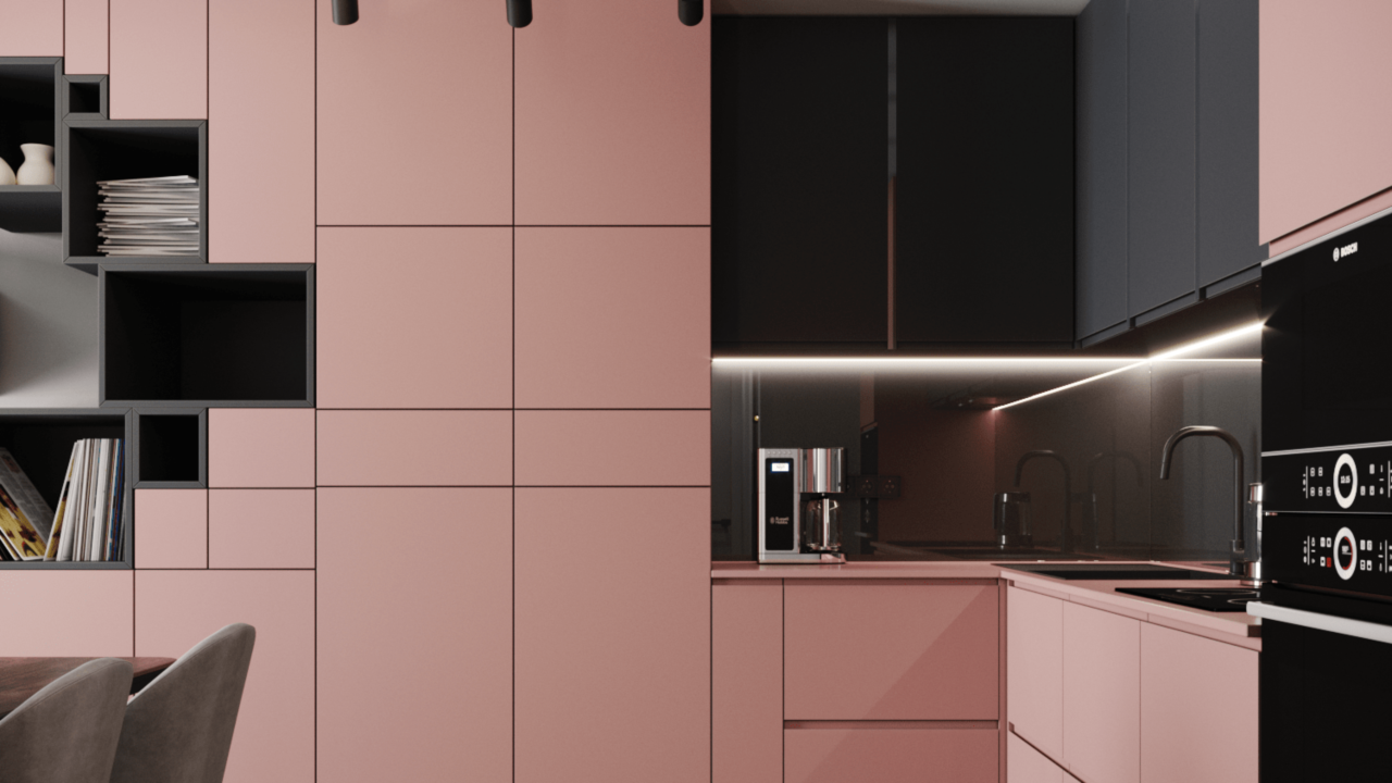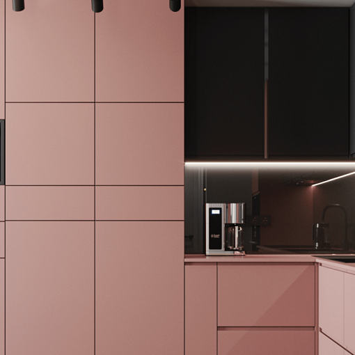 Смелое и одновременно нежное решение для кухонного гарнитура. Темные верхние фасады идеально сочетаются с пастельным ягодным оттенком на нижних фасадах. Матовая поверхность на фасадах и столешнице элегантно смотрится и практична в использовании, а отсутствие ручек и насыщенная темная текстура стеновой панели делают эту кухню ультрасовременной и запоминающейся.