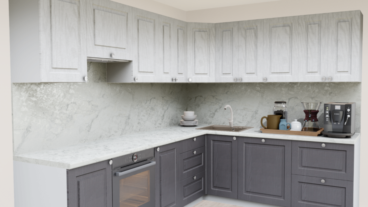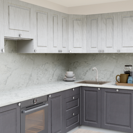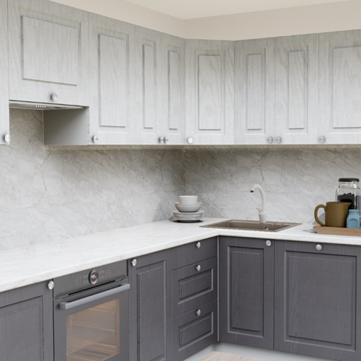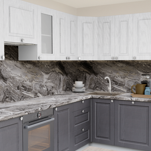 4. Угловая кухня Роялвуд белый 5005 Прямоугольник со столешницей 7031-Q Мрамор Бергамо и со стеновой панелью 7031-Q Мрамор Бергамо.