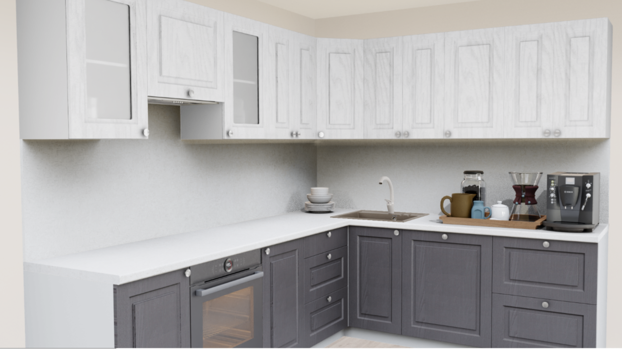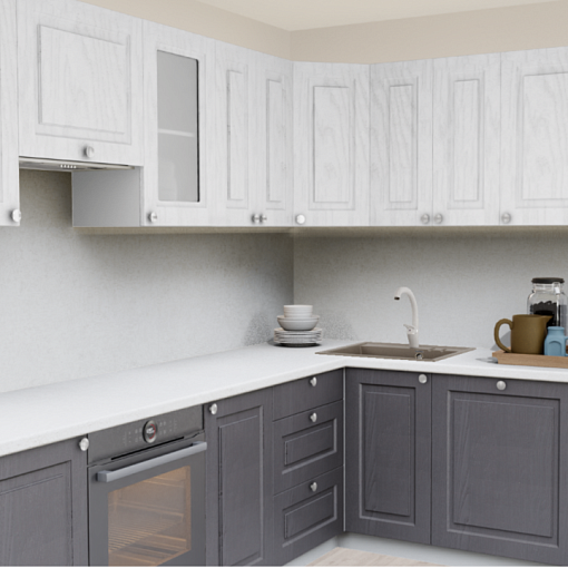 3. Угловая кухня Роялвуд белый 5005 Прямоугольник со столешницей 7020-FL Капри светлый и со стеновой панелью 7020-FL Капри светлый.
