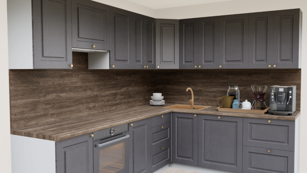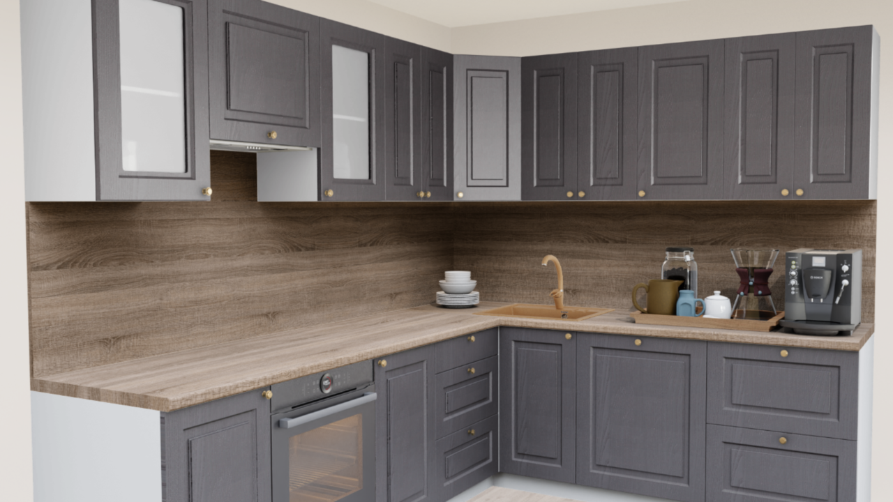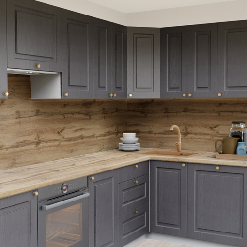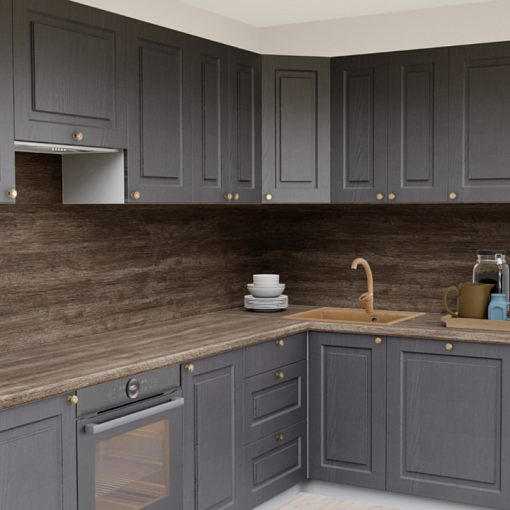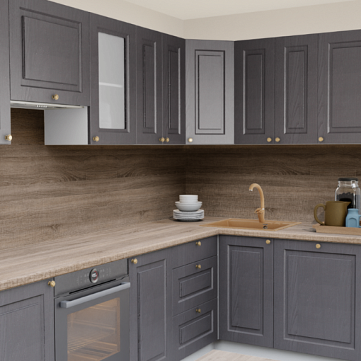 Угловая кухня Роялвуд графит 5095 Прямоугольник со столешницей 232-S Дуб Ниагара и со стеновой панелью 232-S Дуб Ниагара.