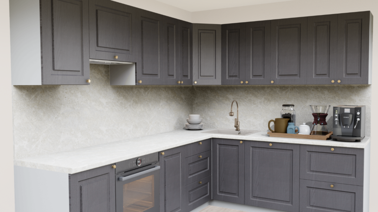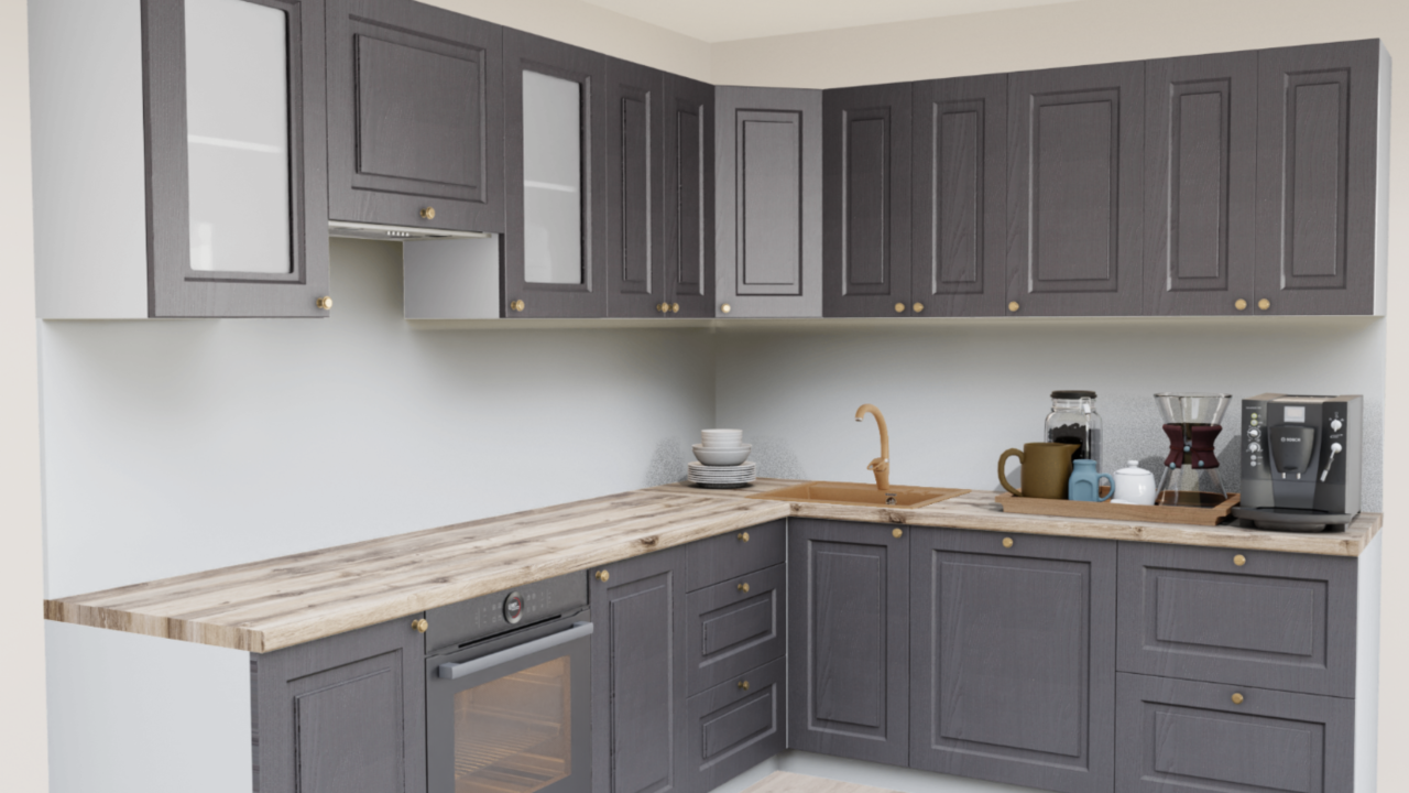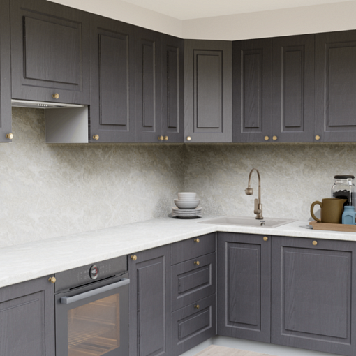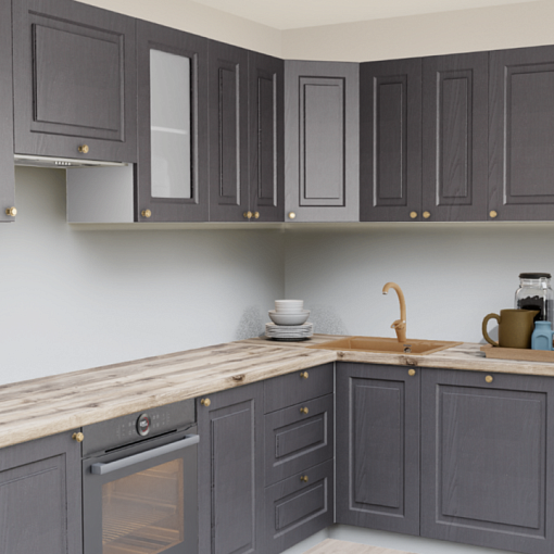 Классическая кухня в темных тонах станет настоящим украшением интерьера. Актуальный оттенок графита в сочетании с эффектом крашеного дерева и строгой фрезеровки дополняется изящными ручками-кнопками. Благодаря выбору столешницы и дополнительных аксессуаров можно создать кухню, на которой будет уютно именно вам.