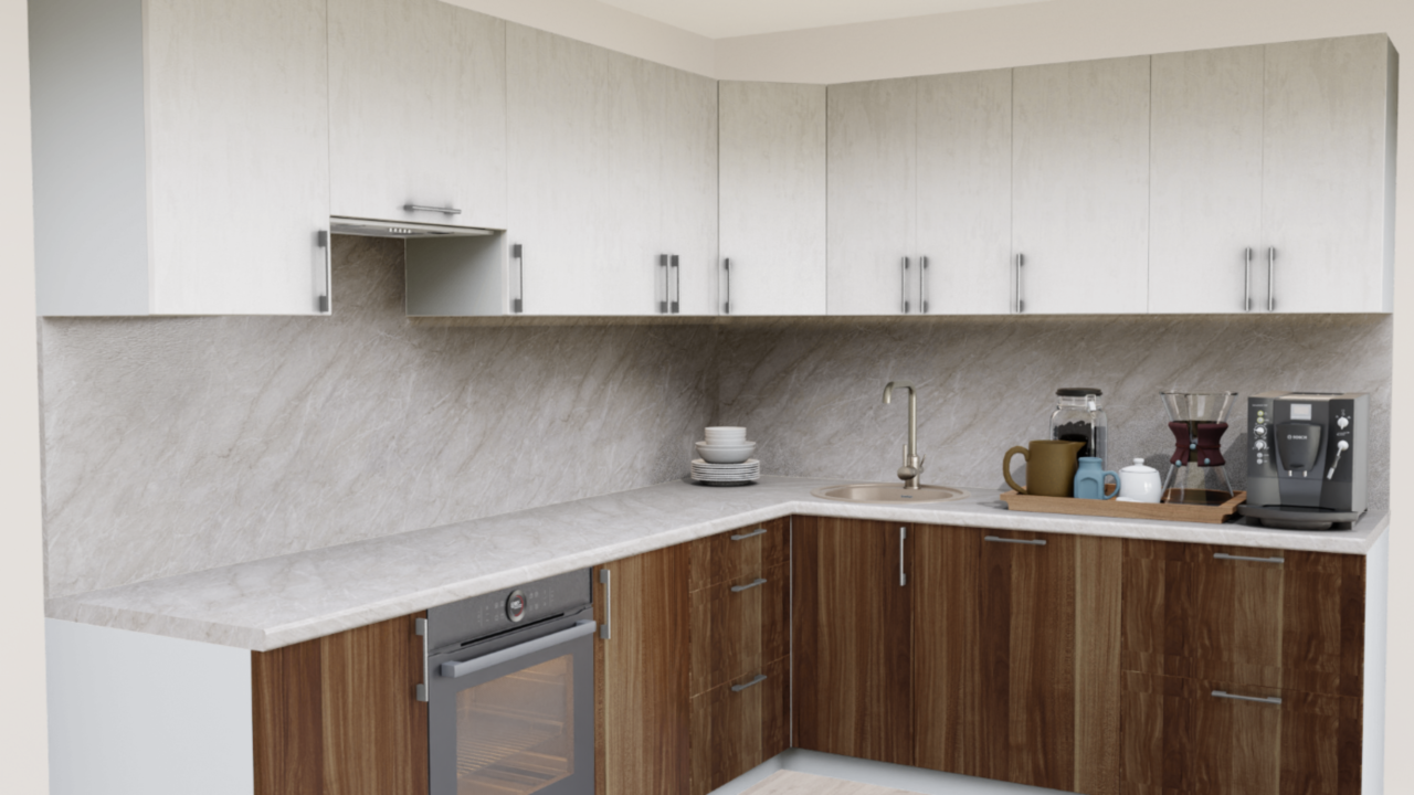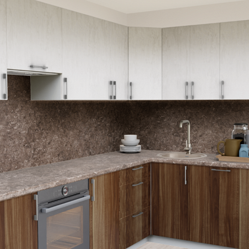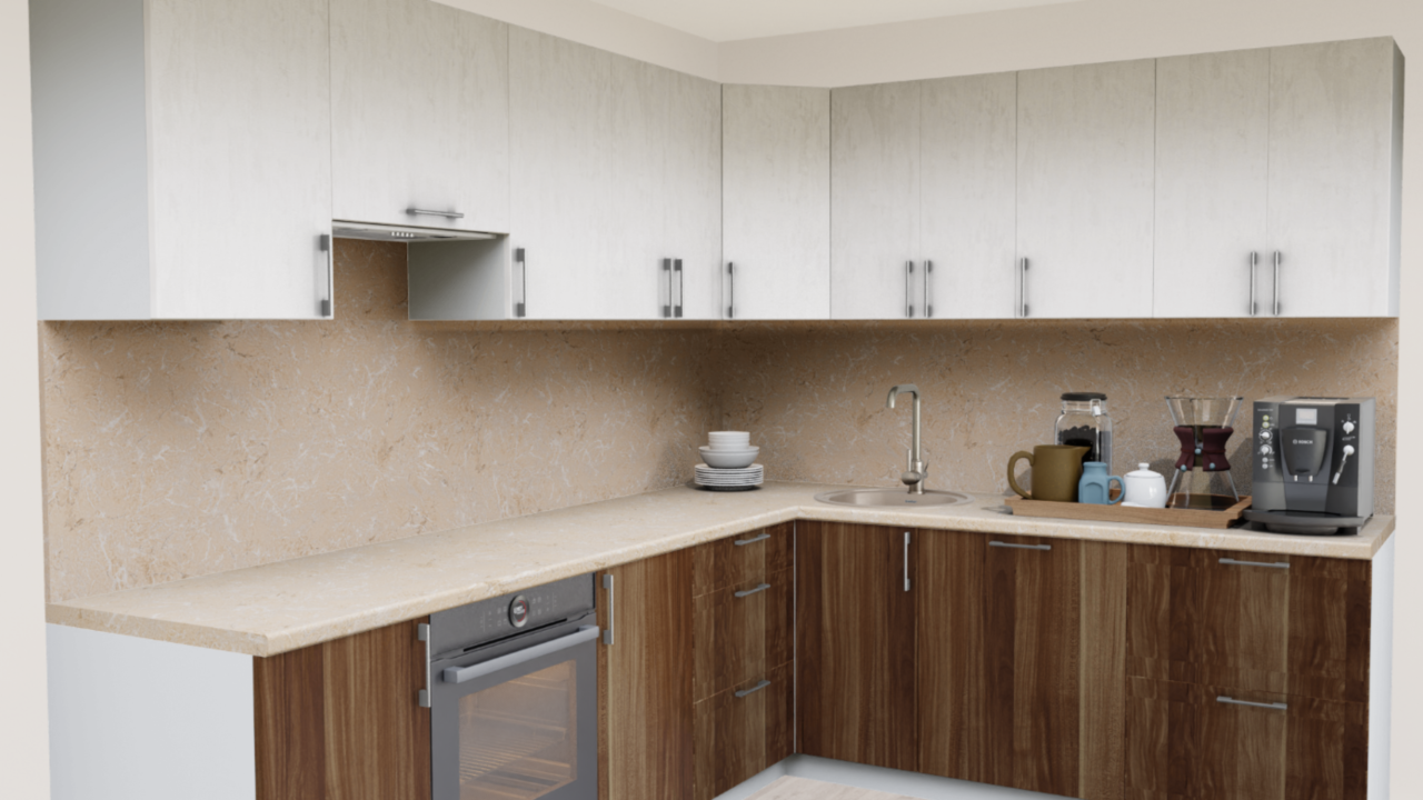1. Угловая кухня Штукатурка кремовая 1863 со столешницей 4035-S Аламбра темная и со стеновой панелью 4035-S Аламбра темная.