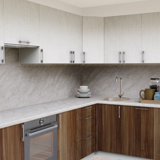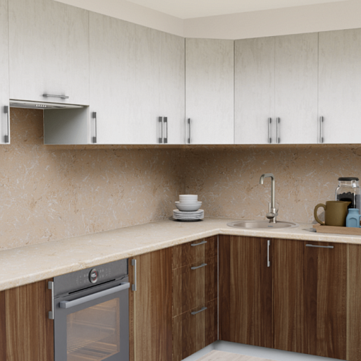 3. Угловая кухня Штукатурка кремовая 1863 со столешницей 9585-S Мрамор бежевый светлый и со стеновой панелью 9585-S Мрамор бежевый светлый.