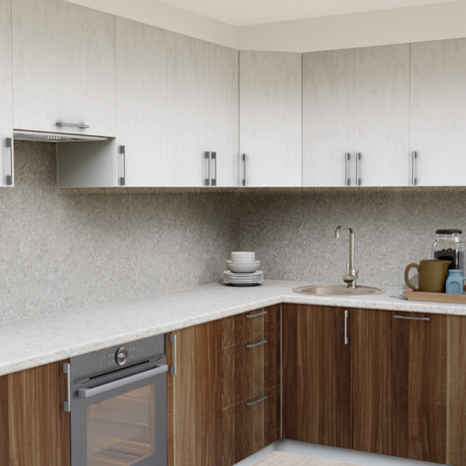 Кухонный гарнитур в сочетании эффекта штукатурки на фасадах и яркой насыщенной текстуры дерева на фасадах - актуальная тенденция современного дизайна. Нейтральные оттенки столешницы и простая форма ручек подчеркивают это оригинальное решение, создавая кухню с индивидуальным характером и стилем.