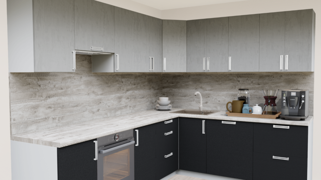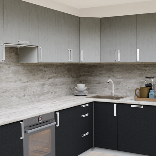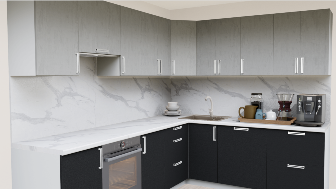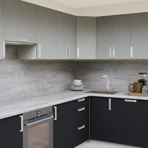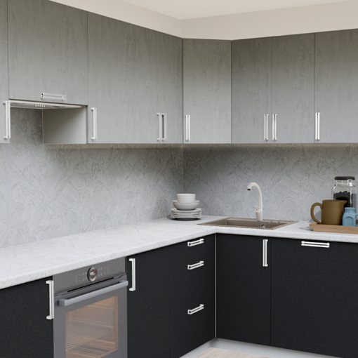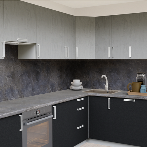 1. Угловая кухня Штукатурка серая 1864 со столешницей 7351-S Stromboli Grey и со стеновой панелью 7351-S Stromboli Grey.