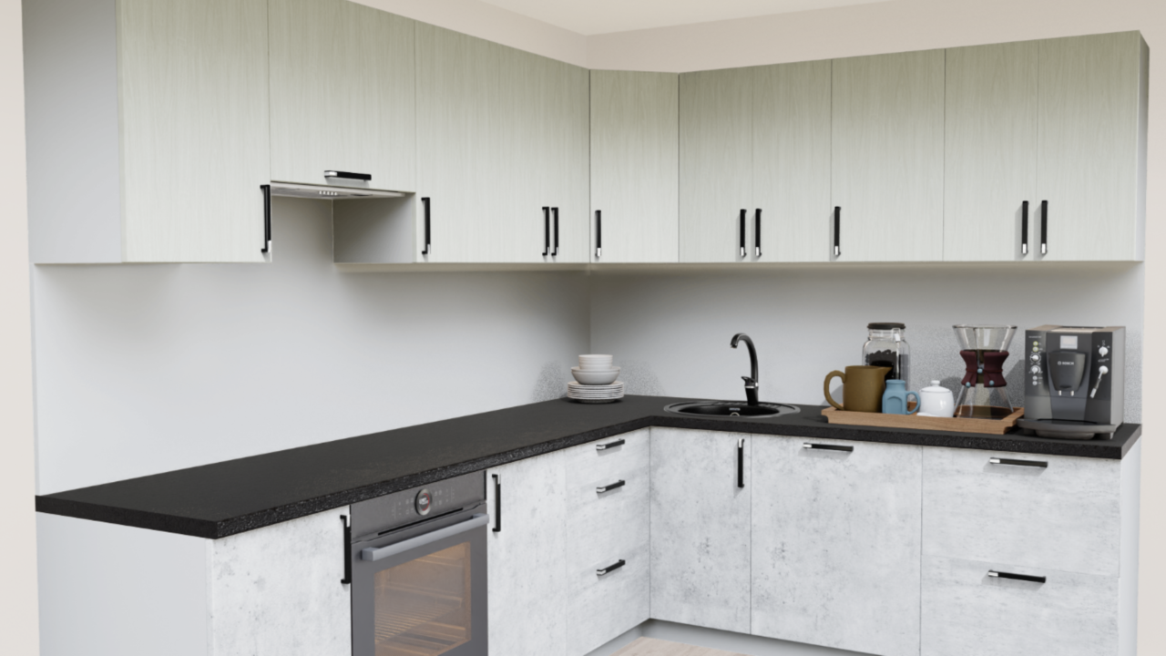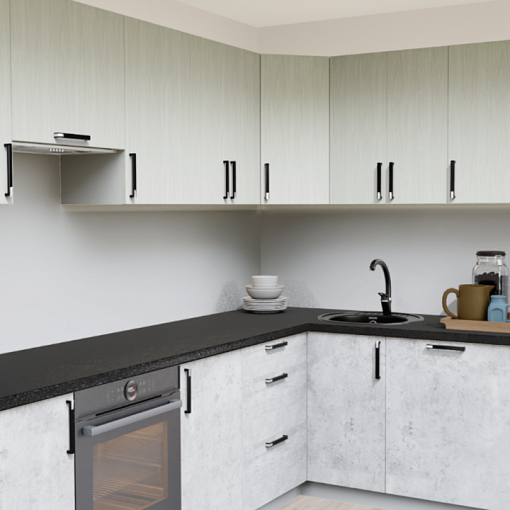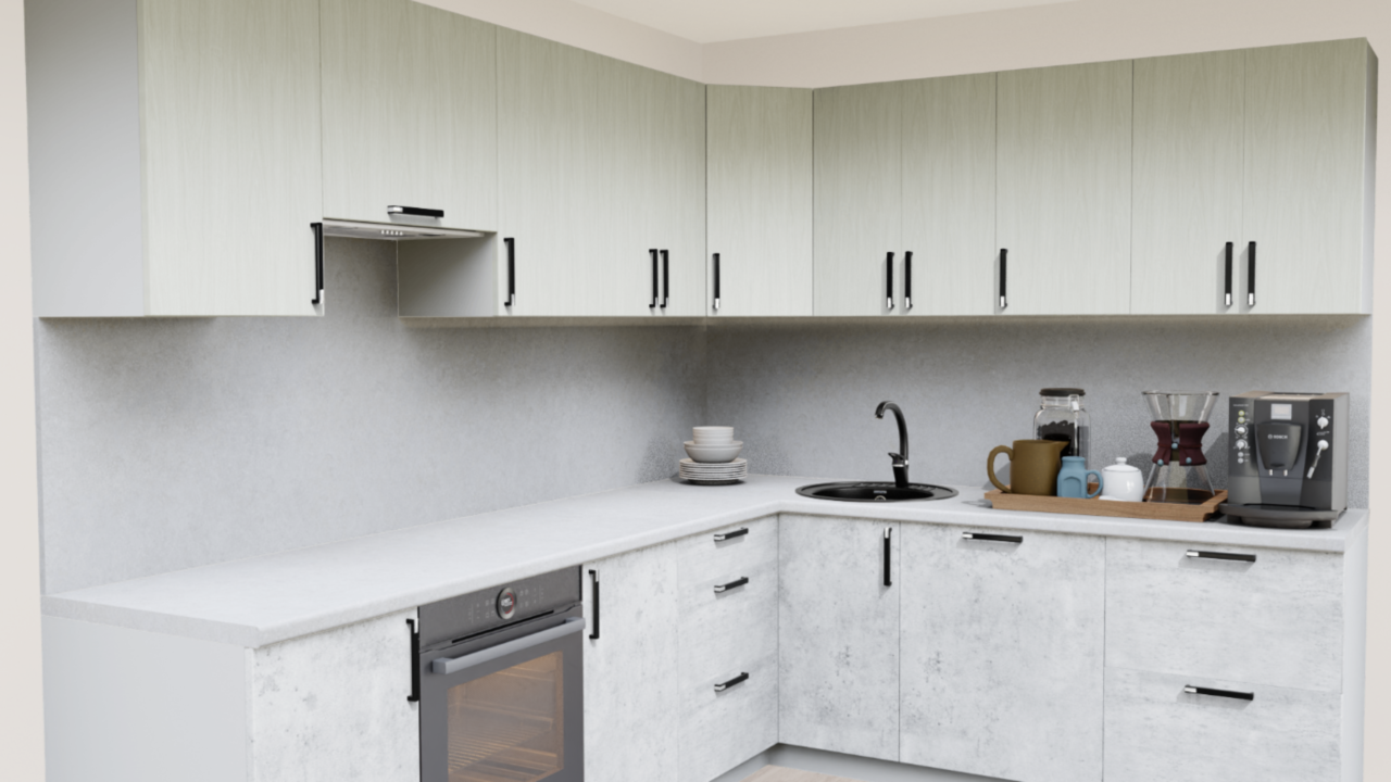 Светлый кухонный гарнитур в сочетании бетона и дерева - современный тренд в дизайне. Светлые оттенки фасадов и столешницы дают возможность применить этот вариант в помещении любого размера, а нейтральная цветовая гамма позволяет добавить индивидуальности за счёт цвета отделки и предметов декора.