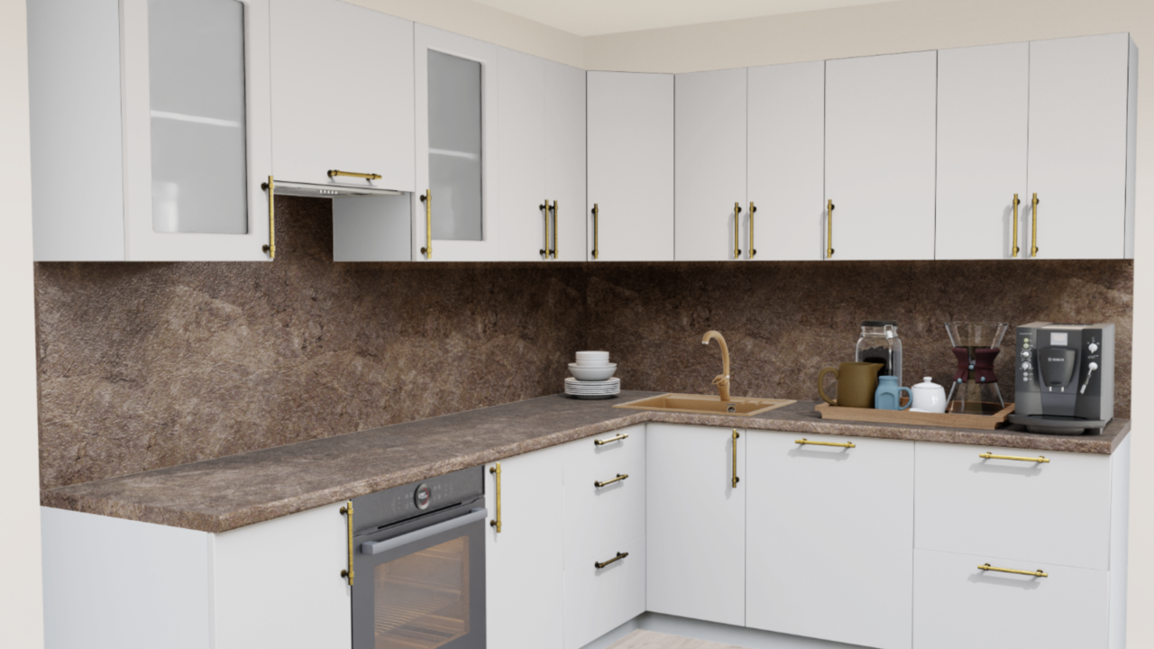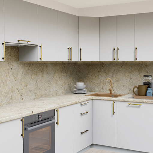 Угловая кухня Супермат панакота 8916 со столешницей 3024-S Мрамор золотой и со стеновой панелью 3024-S Мрамор золотой.