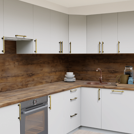 Угловая кухня Супермат панакота 8916 со столешницей 2062-S Трансильвания и со стеновой панелью 2062-S Трансильвания.