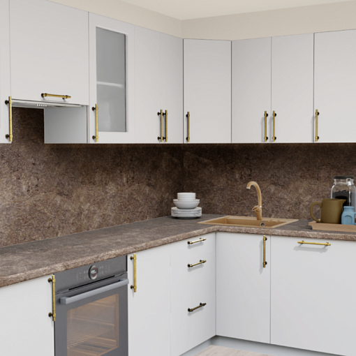 Угловая кухня Супермат панакота 8916 со столешницей 910-Br Обсидиан коричневый и со стеновой панелью 910-Br Обсидиан коричневый.