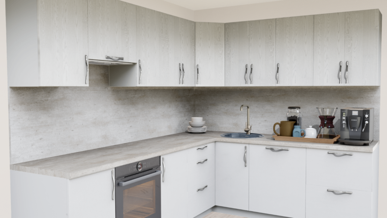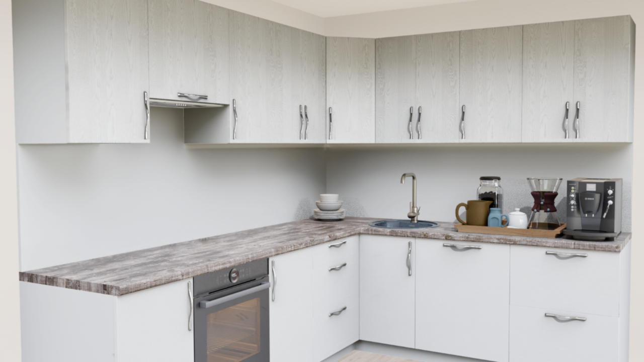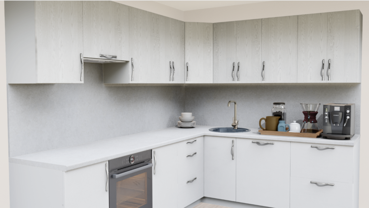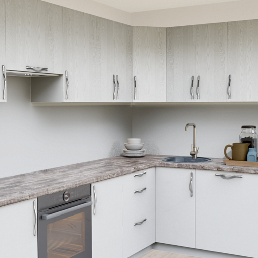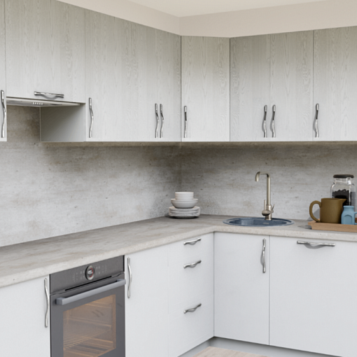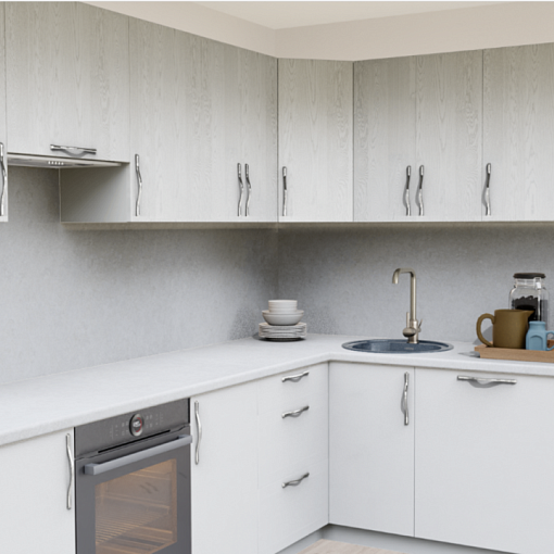 3. Угловая кухня Ясень натуральный 9132 со столешницей 2047-S Кантри и со стеновой панелью 1110-S Белый.