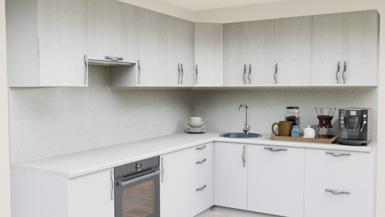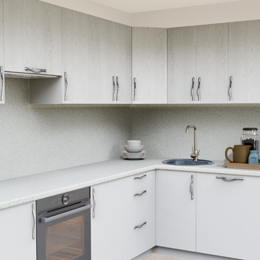 5. Угловая кухня Ясень натуральный 9132 со столешницей 4040-S Антарес и со стеновой панелью 4040-S Антарес.