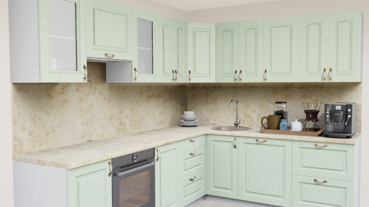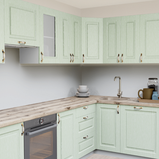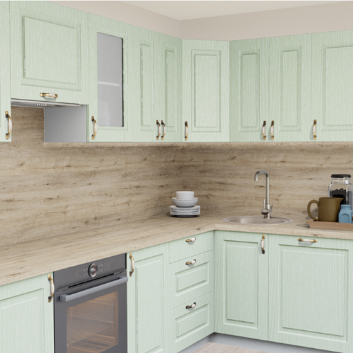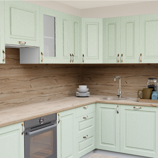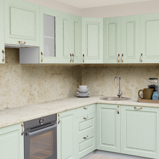 4. Угловая кухня Зелень патина 246 ТР Прямоугольник со столешницей 7020-FL Капри светлый и со стеновой панелью 7020-FL Капри светлый.