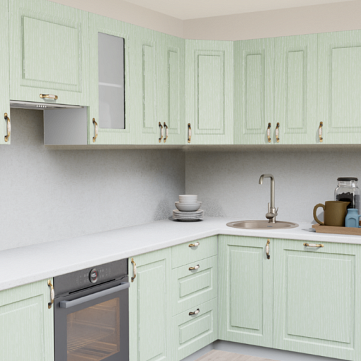 Кухонный гарнитур с фасадами из МДФ с легкой патиной делают непринужденной атмосферу за счёт нежного зеленого цвета и эффекта крашенного дерева. Естественные оттенки на поверхности столешницы поддерживаются теплотой бронзовых ручек, создавая неповторимое очарование этого решения.